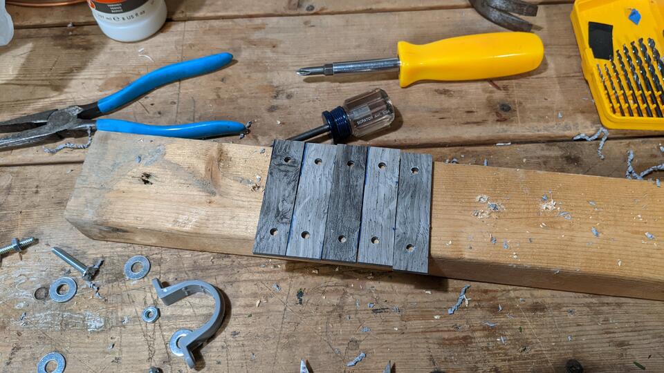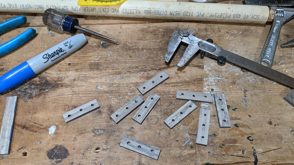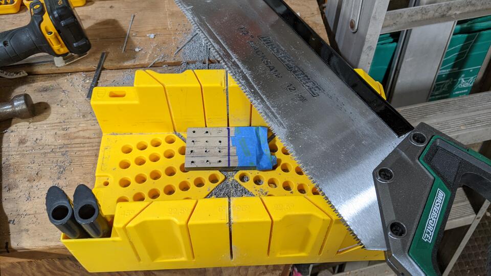 Measure and cut out five strips of bracket material from the sample piece, and drill the two mounting holes in each. I cut these using a cheap plastic miter box and back saw, no power saw required. I drilled the two holes into one of the rectangles by hand with the drill motor (as opposed to on a drill press), checked that they lined up with the conduit strap, then used that piece to line up the drill locations on the other brackets, drilling them two at a time until I had all five pieces drilled. They came out looking square enough.