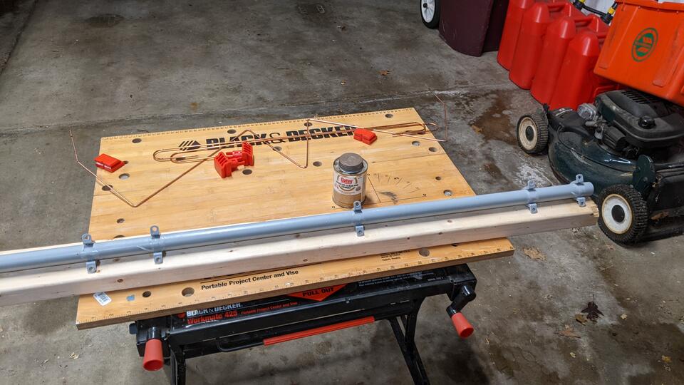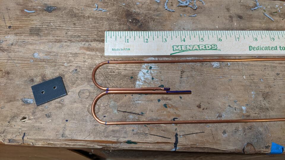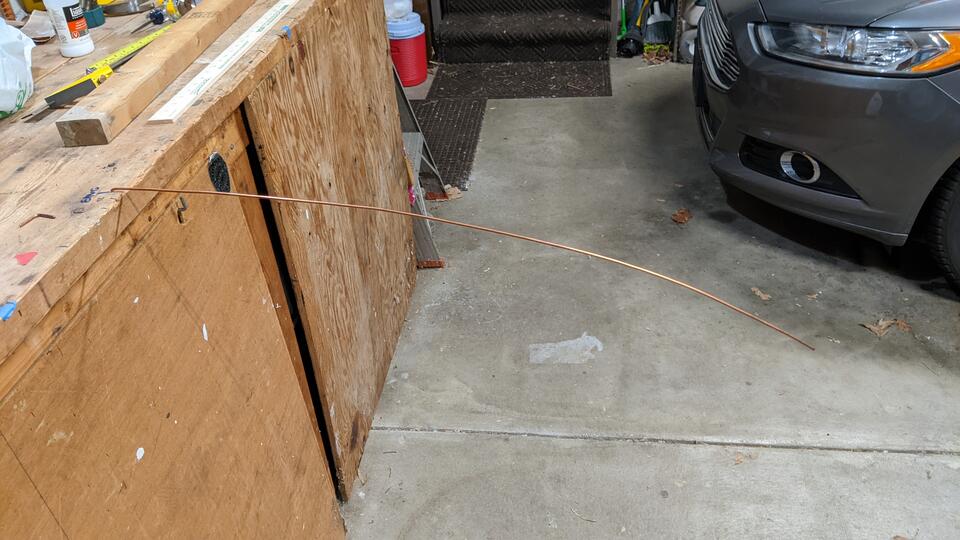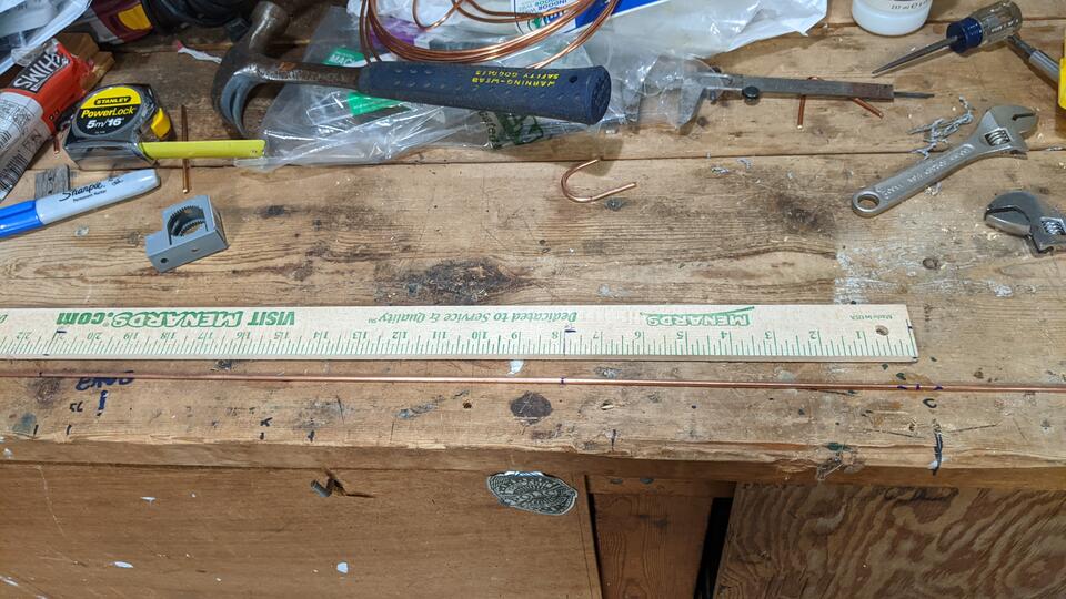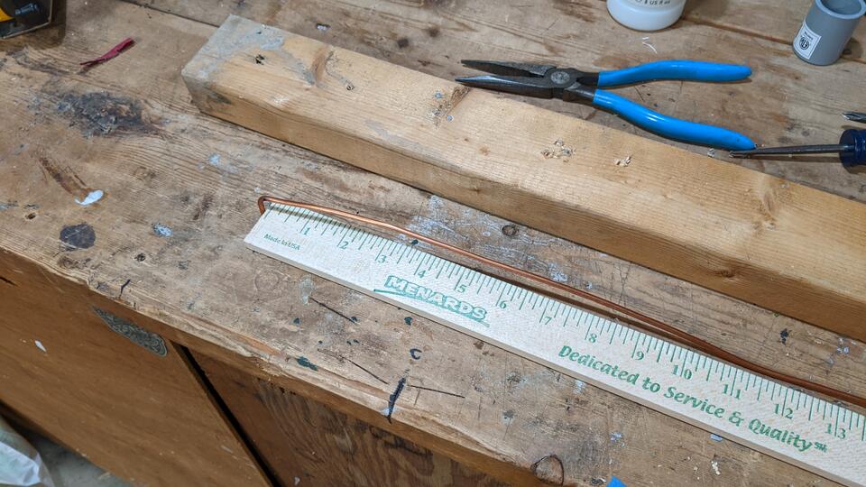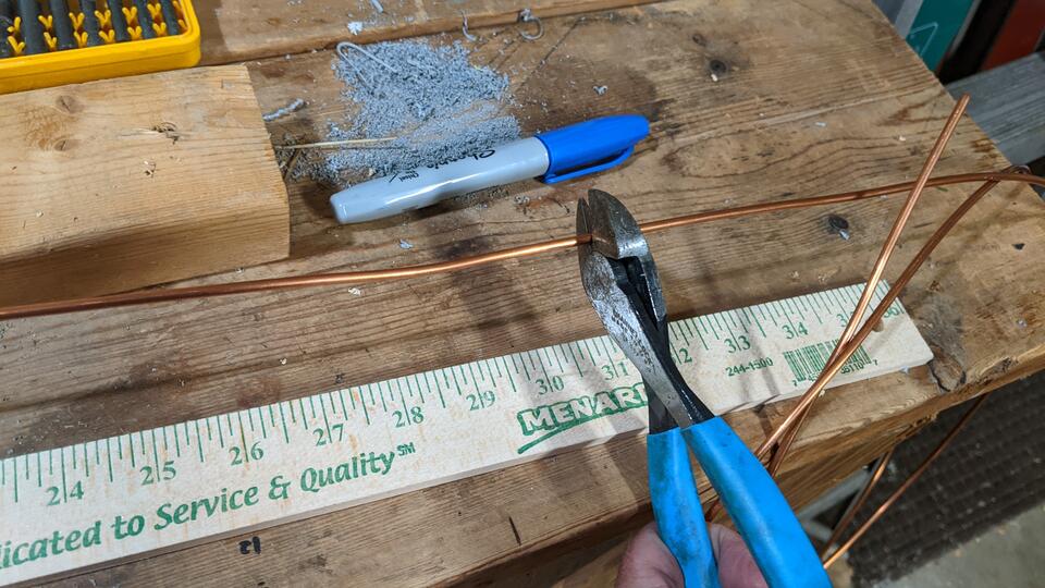 Find the center of the VHF element wire, mark it with the sharpie marker, and use the yardstick to mark where you are going to make your bends in the wire. A small piece of PVC conduit works great as a bending form for the two half-loops that you need to make in each element. So would a dowel, or a broom stick. You'll probably be able to bend this wire around the form by hand, like I did, or you could use some pliers. If you did it right, you'll have some slop wire left at the ends to trim off later. Don't worry if your radius bend isn't 100% perfect here. Just get the parallel sections to be the correct lengths and distance apart, and it'll be OK.