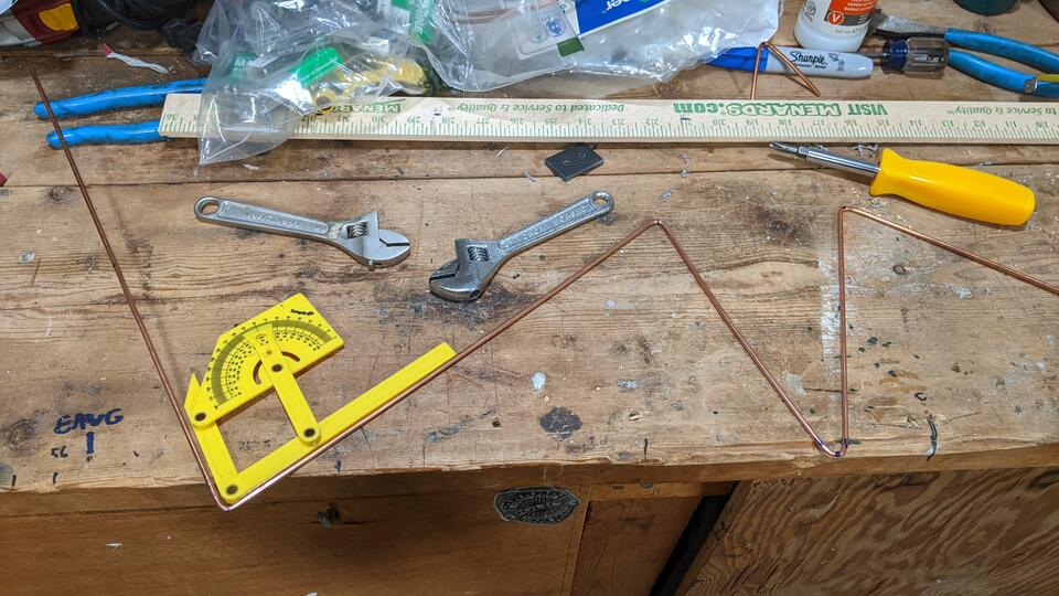 Mark the center of the wire, and start your bending process from that mark. That is the bend where the feedpoint will connect, at the middle conduit strap. Bend from the center out toward the ends of the wire, so that the extra slop left in the wire will end up at the two ends, where it can be trimmed later. I used a pair of small adjustable wrenches to put the bends into my wires, but a pair of linesman pliers, or a peg jig should work just fine too. Check your work using the angle finder (and the bend angles that I conveniently put on the plans!) and a measuring tape as you go.