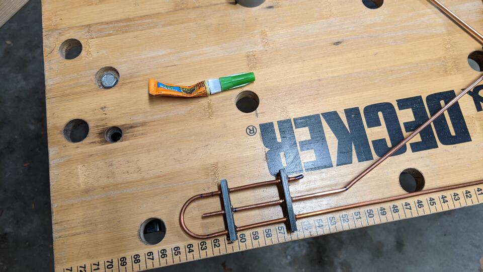 Once the standoffs are in place, make your final adjustments to the angles and placement of the elements. The VHF element may want to 'twist' around the UHF element, so when you go to glue in the supports, you'll need to keep the standoffs flat. Lay the antenna on its face, apply the glue to the wire elements and standoff holes, and then put a weight like a small two-by-four on top to hold them down while the glue dries. The superglue gel from the parts list has a lot of body and maybe thirty seconds of 'working time', so keep the joints still for a few minutes before moving on to the next set.