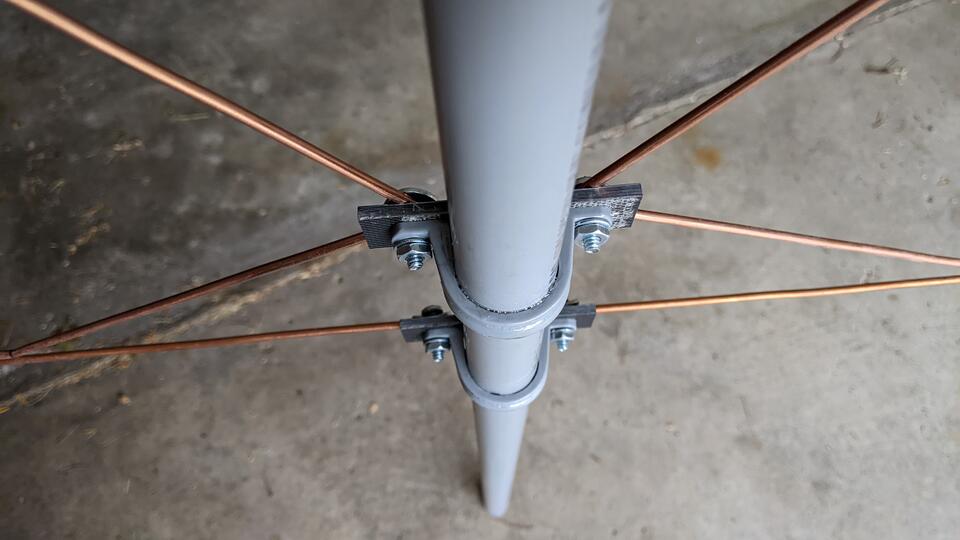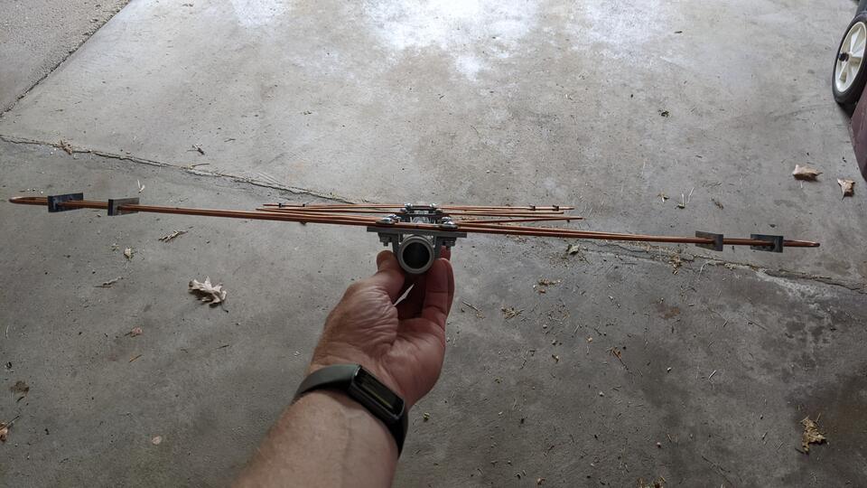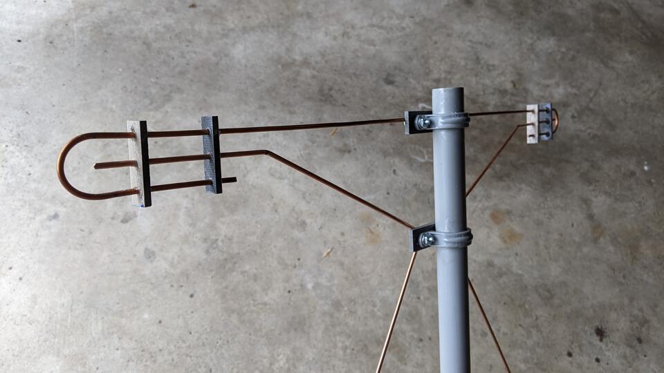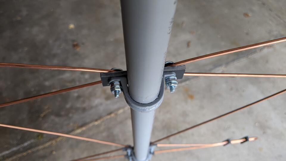 Once the four wire elements are cut and bent, and after the conduit strap glue has dried, its time for assembly. The NEC model of the antenna uses 1" bolts all around, but simulation tests showed that shorter bolts always perform marginally better. For construction, I kept the 1" machine screws for the feed support bracket, but was able to change to shorter 3/4" machine screws for the four non-feed support brackets.