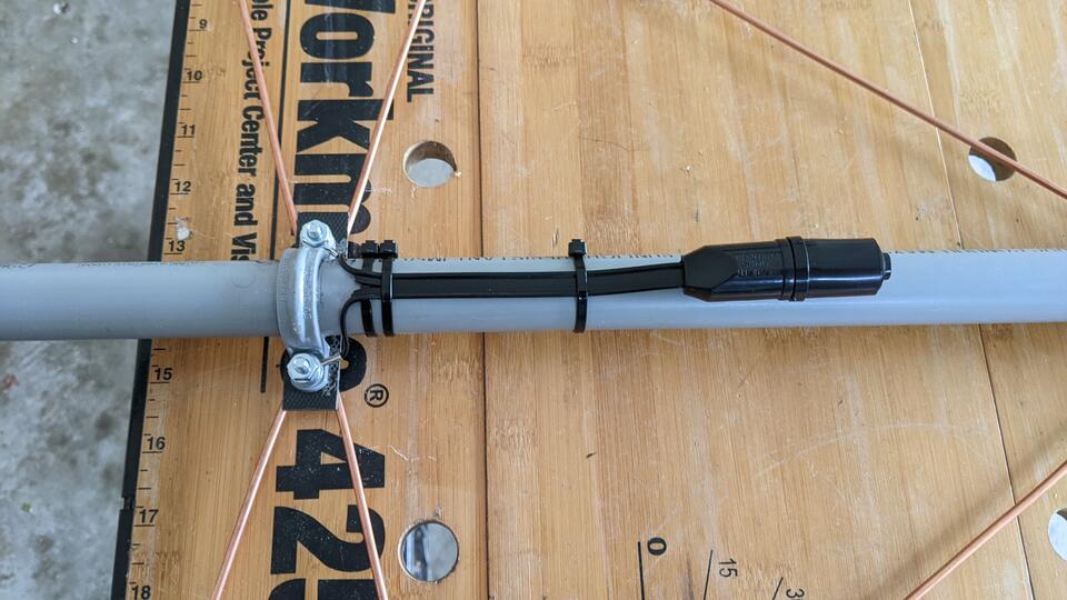 Its the last step before mounting! Attach the two leads from the balun transformer to the center feed taps, and tighten down the nuts. Use a few zip ties to secure the transformer to the pole. Note that the transformer has a weatherproof boot, and that should be pointing down toward the bottom of the antenna.
